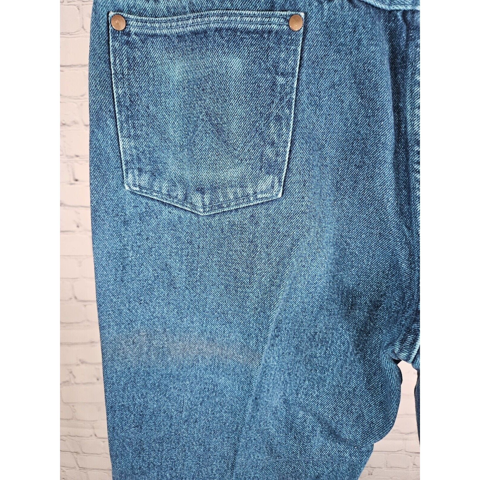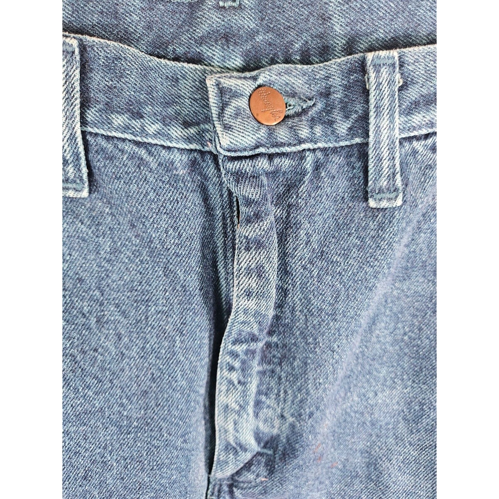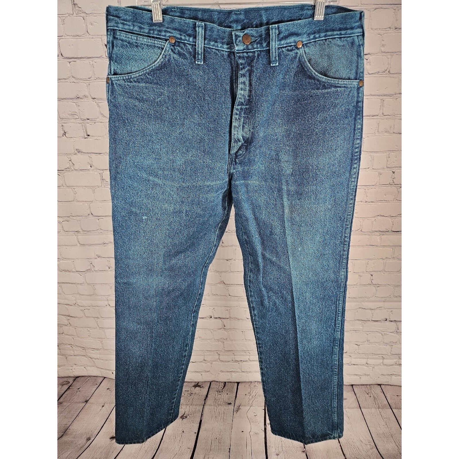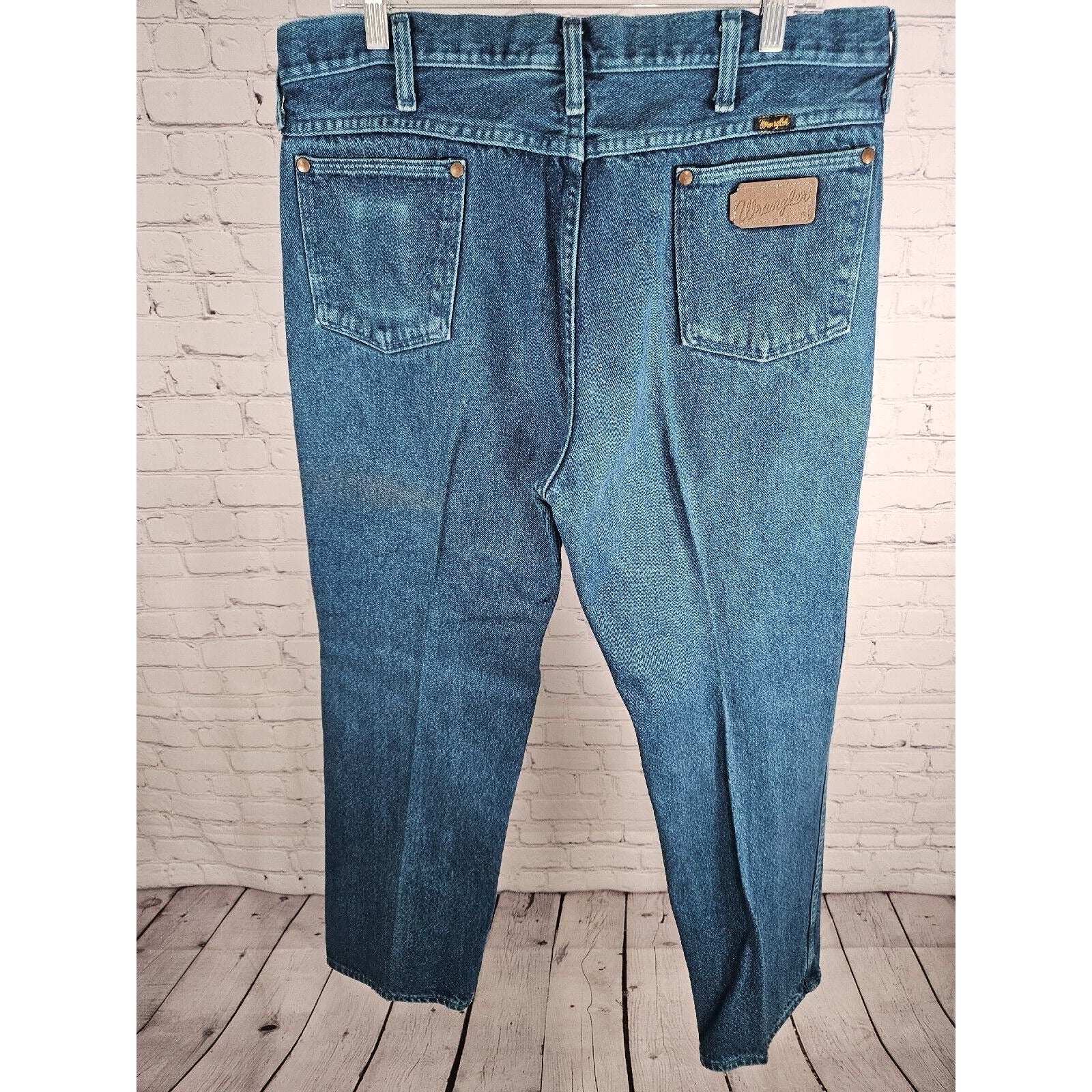 The jeans are made from 100% cotton denim and are machine washable for easy care. They come in a size 36 waist and 32 inseam, with a regular fit. The original size on the tag was 38 x 32, however, the current waist measurement is 36". Perfect for any season, these jeans are a great choice for anyone looking for a retro, cowboy-inspired look.