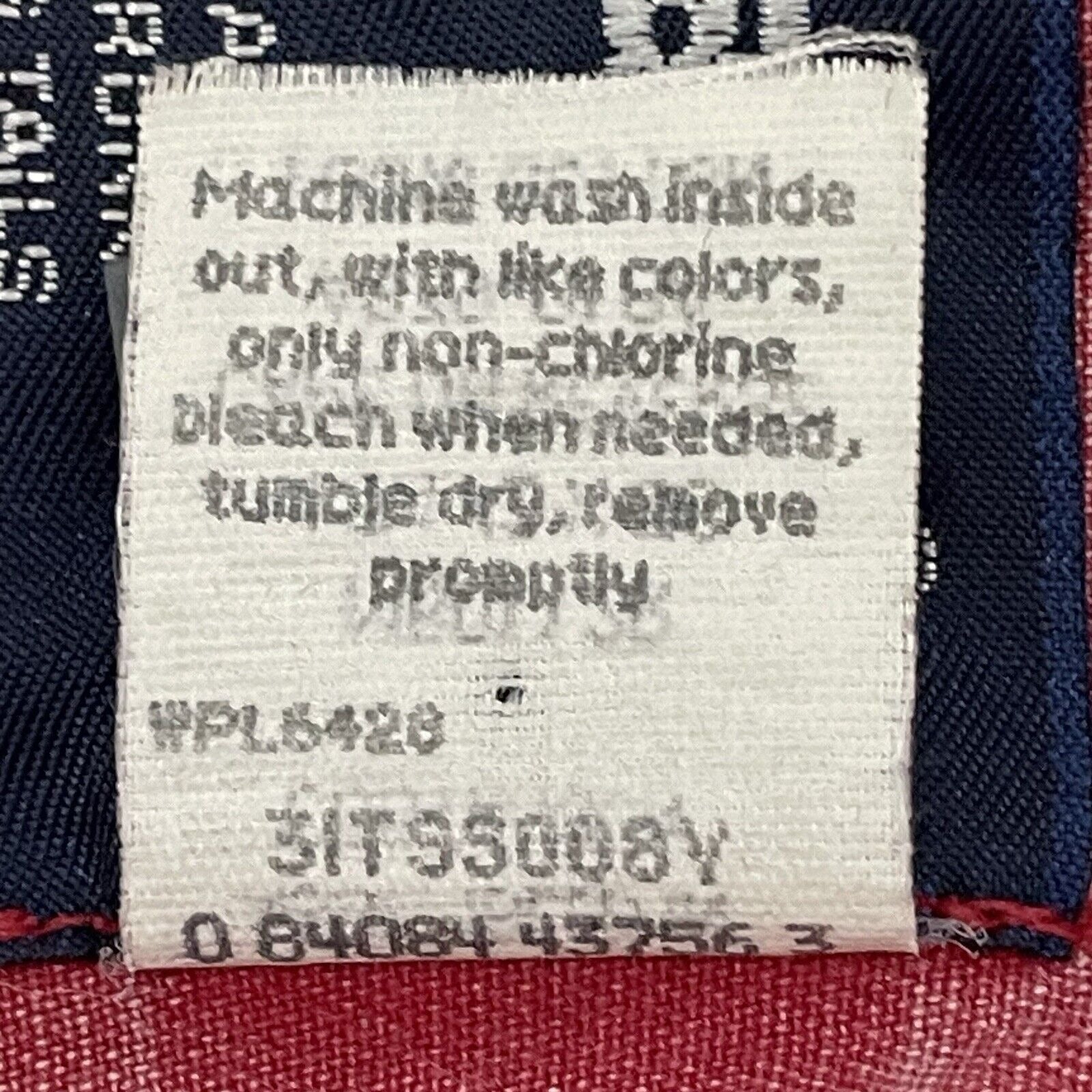 Missing stitching on top of front left pocket and staining on front and back bottom hem, as pictured.