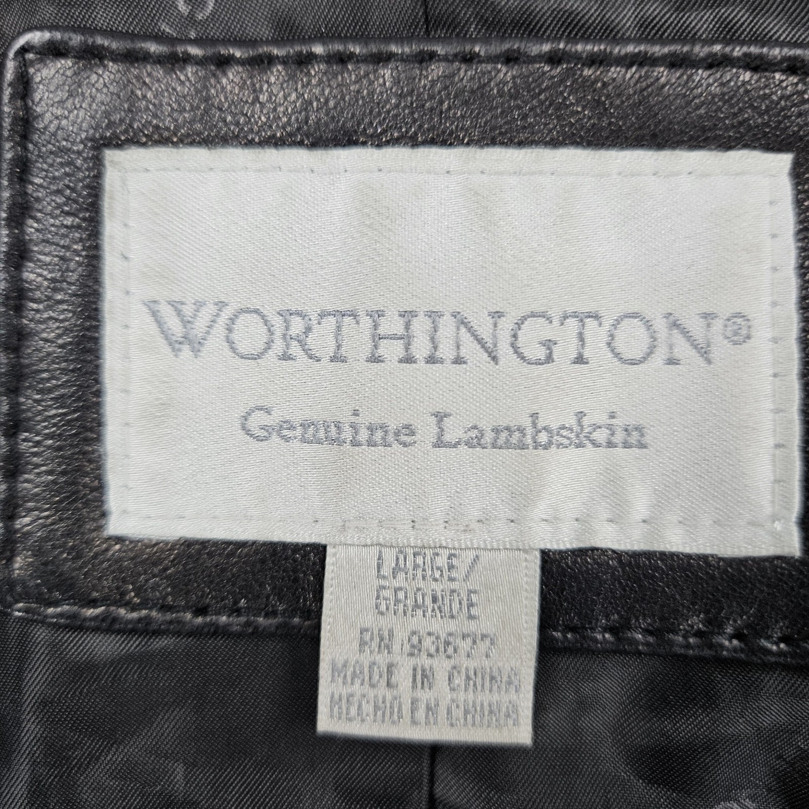 The Worthington Black Genuine Lambskin Leather Snap Lined Blazer Style Jacket in size Large is a stylish and versatile piece for women. Made by Worthington Industries, this jacket features a snap closure and is lined for added warmth and comfort. The classic black color makes it easy to pair with any outfit.