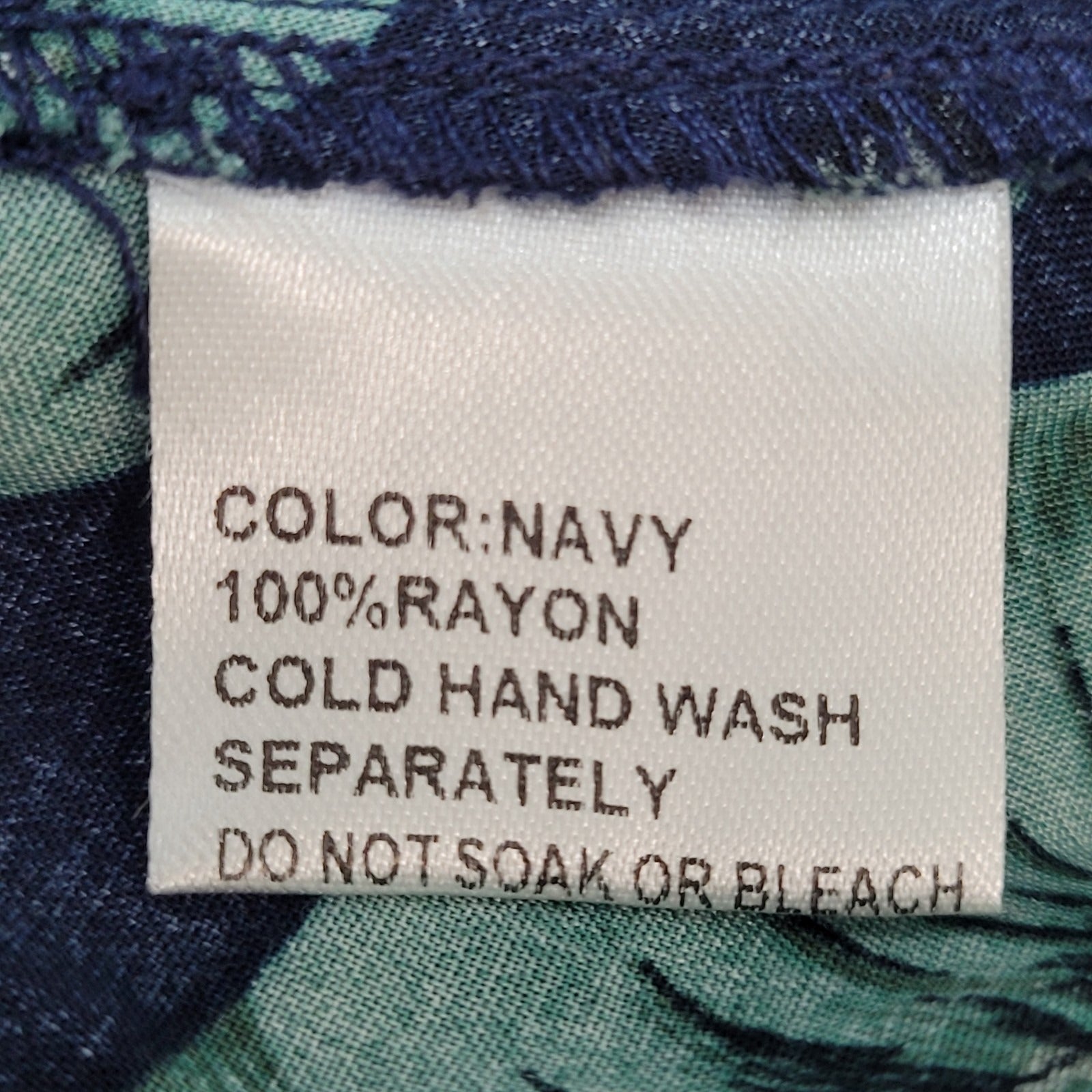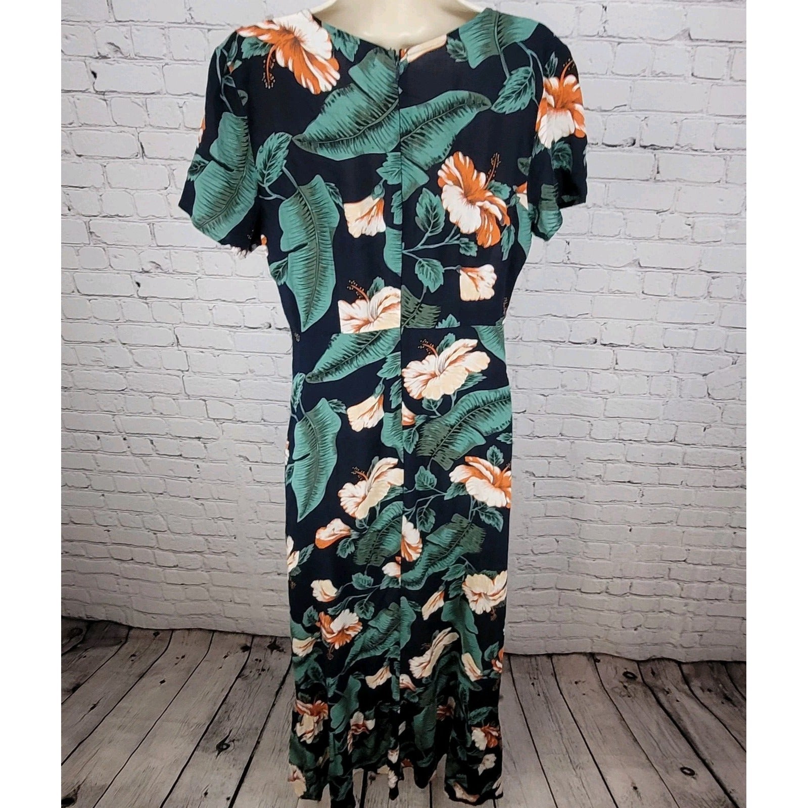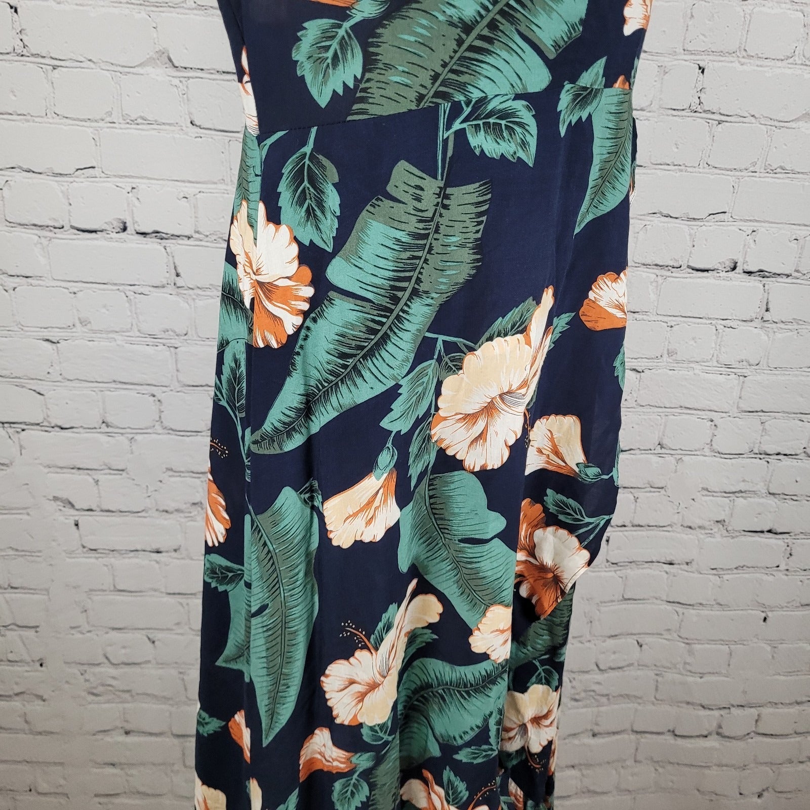 The XIX PALMS Navy Hawaiian Floral Short Sleeve Wrap Hi Low Maxi Dress in size 3 is a stylish and versatile piece perfect for various occasions. The dress features a beautiful floral pattern, V-neckline, and short sleeves, making it ideal for summer, fall, and spring. Made from lightweight rayon material, this dress is easy to care for with hand wash only. The long dress length and hi-low hem add a touch of sophistication, while the tropical Hawaiian theme adds a fun and vibrant touch. Perfect for travel, parties, or casual outings, this dress is a must-have for any fashion-forward woman.