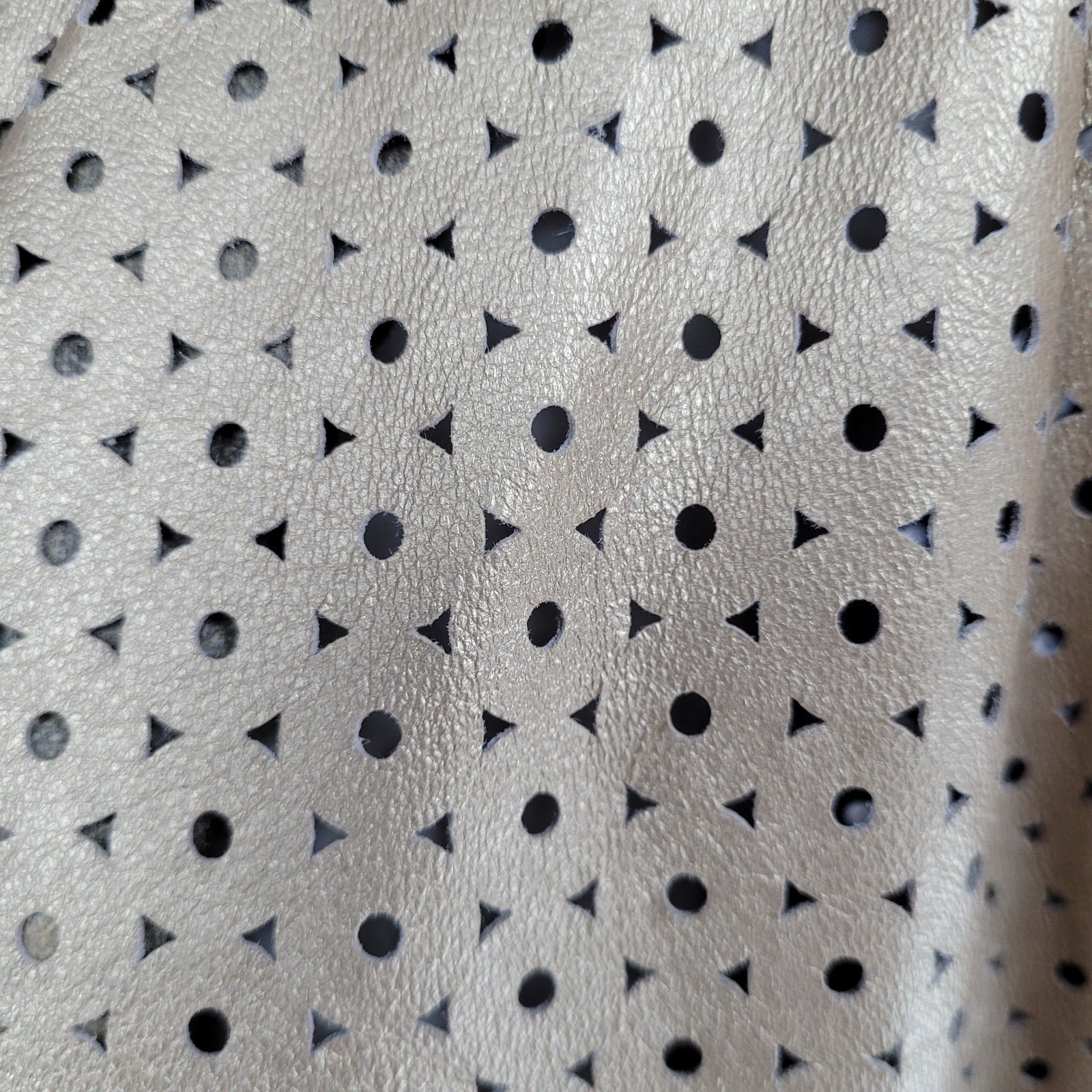 The Yvonne Marie Gold Genuine Leather Open Unlined Jacket in size Small is a stylish and versatile outerwear piece for women. Made from high-quality leather, this geometric-patterned jacket features a collarless design with long sleeves, making it perfect for various occasions from casual outings to business meetings. The gold color adds a touch of glam, while the lightweight and open style make it ideal for layering during the warmer seasons of summer, fall, and spring. Perfect for travel, parties, or everyday wear.