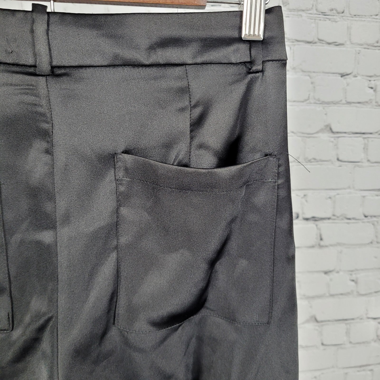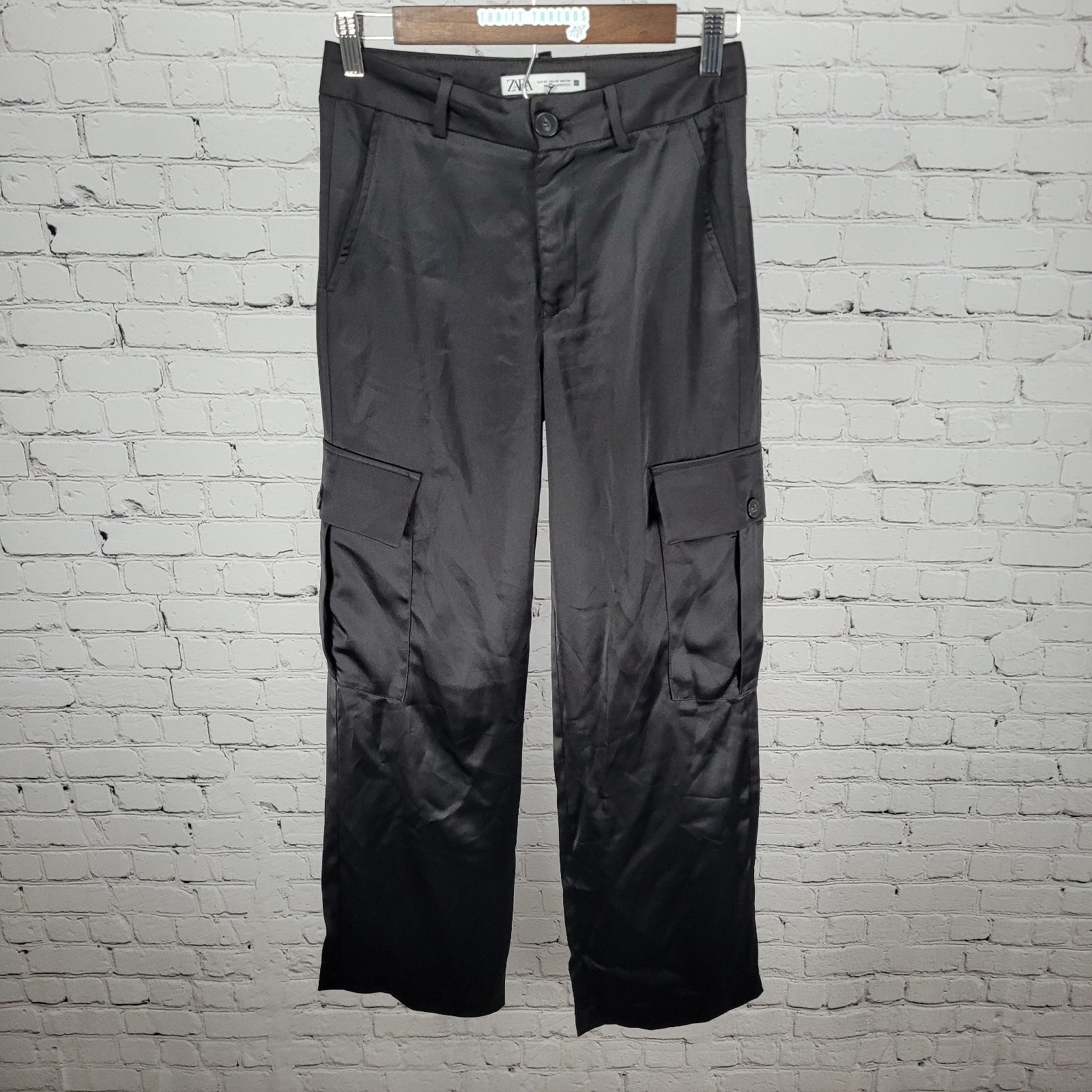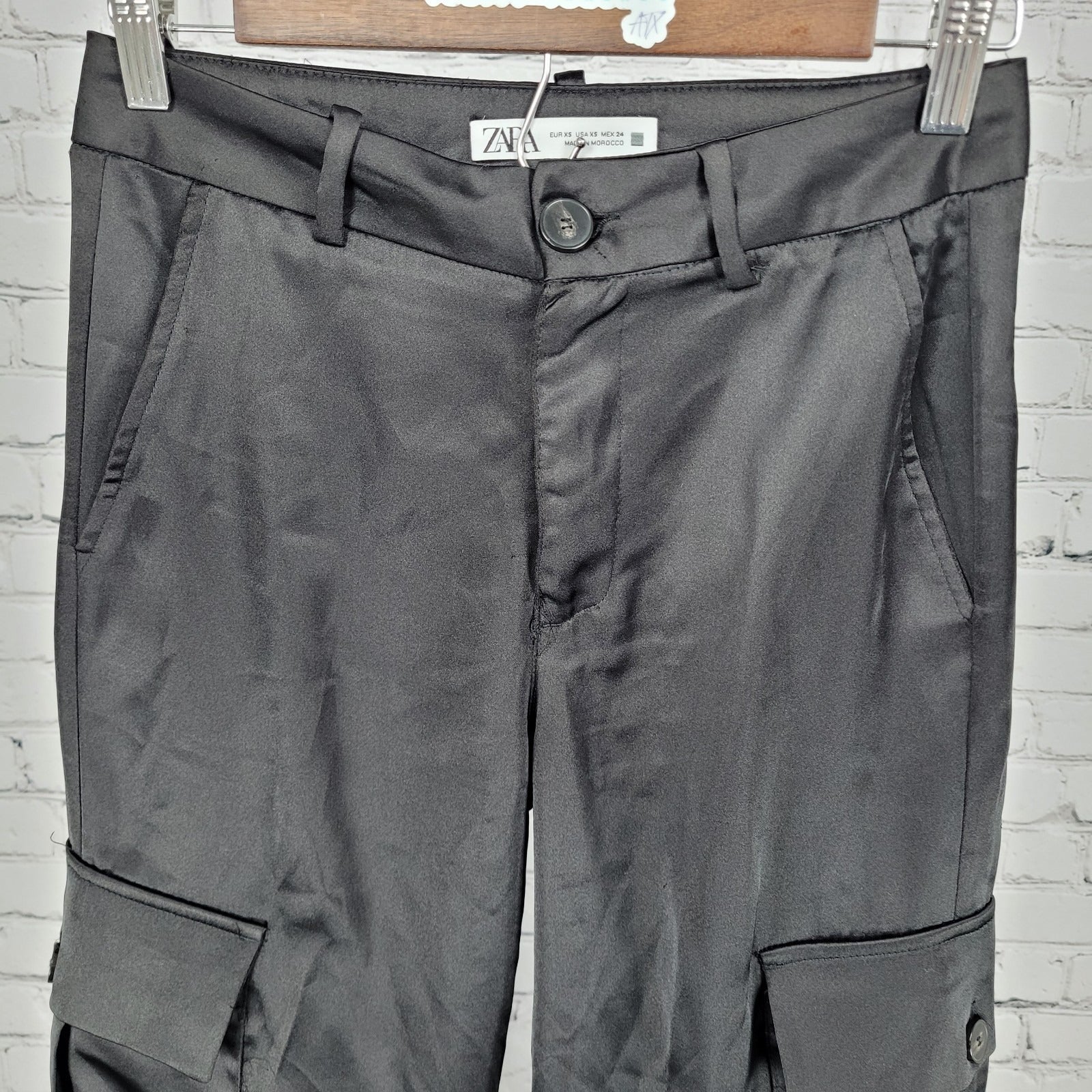 Zara Black Silky Satin Cargo Pockets Straight Leg Mid Rise Pants Size XS (26x29)