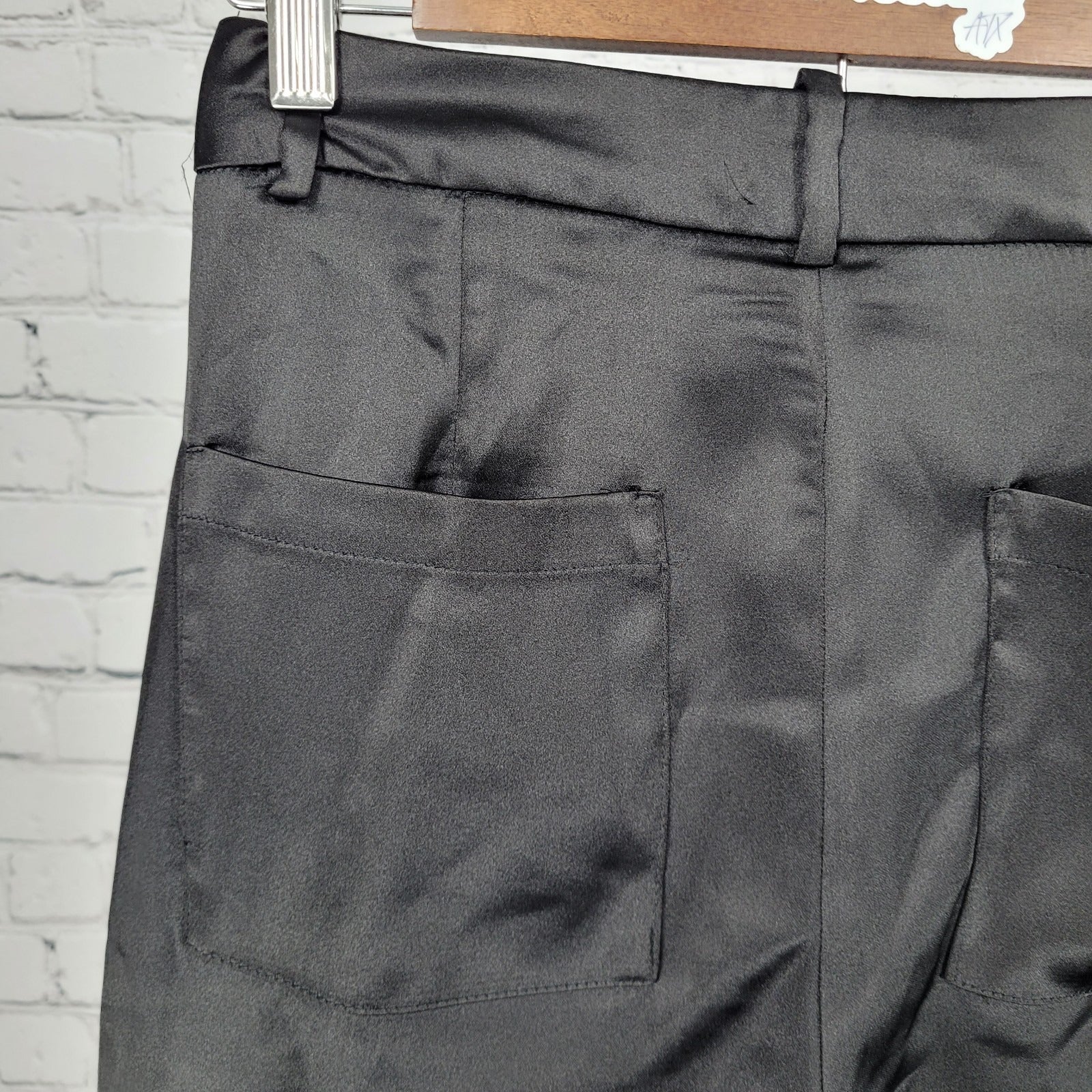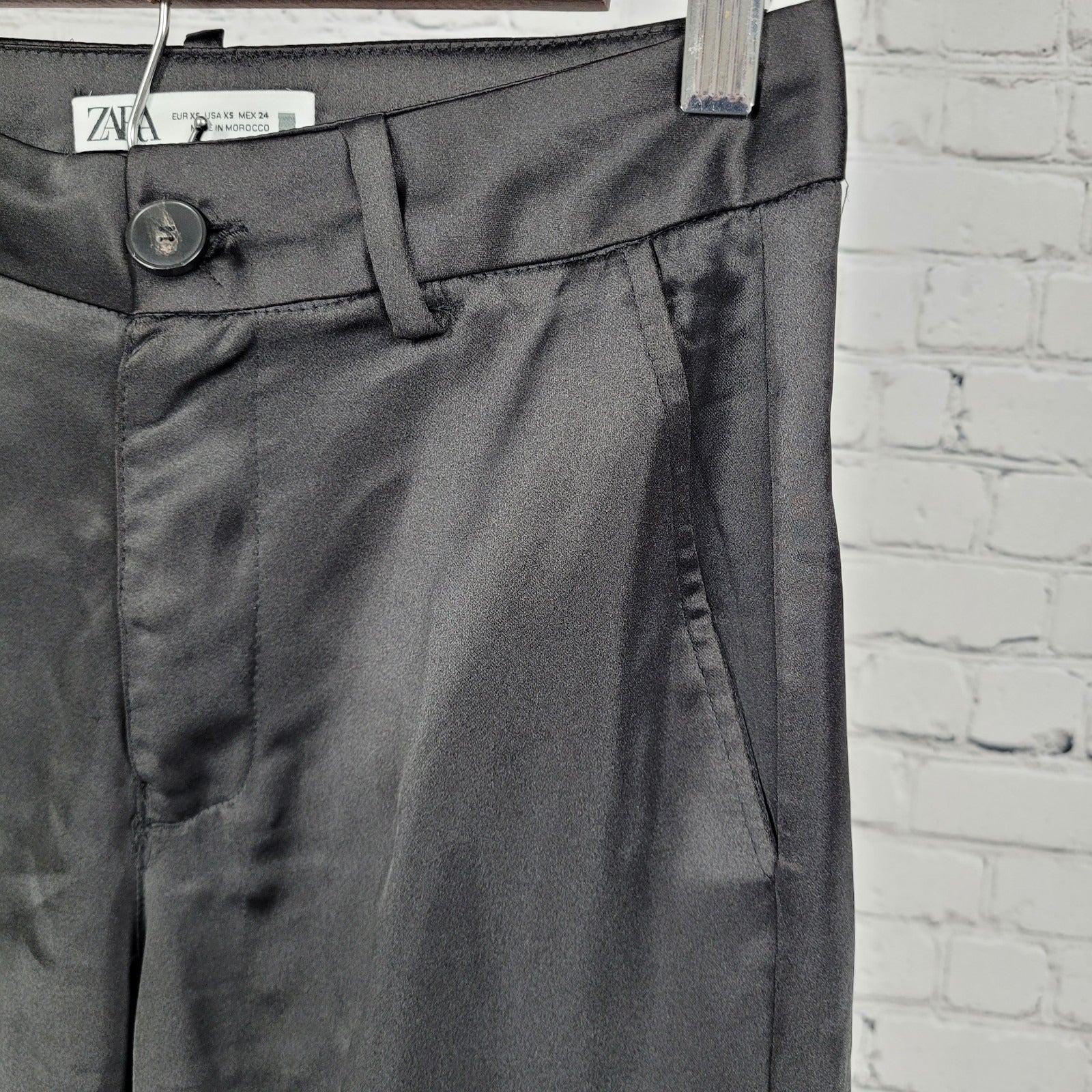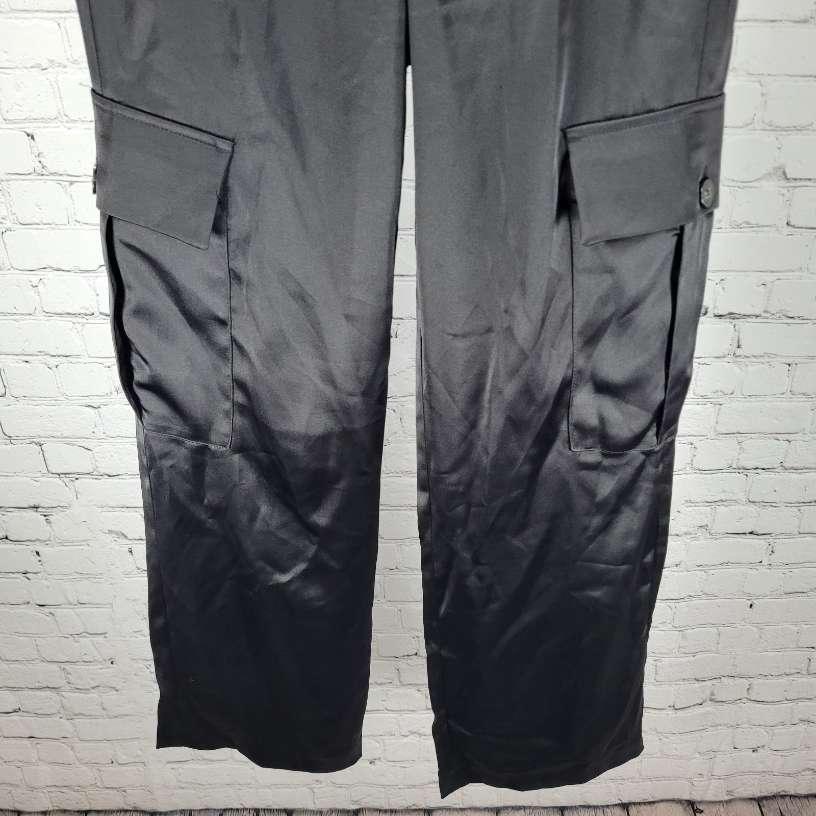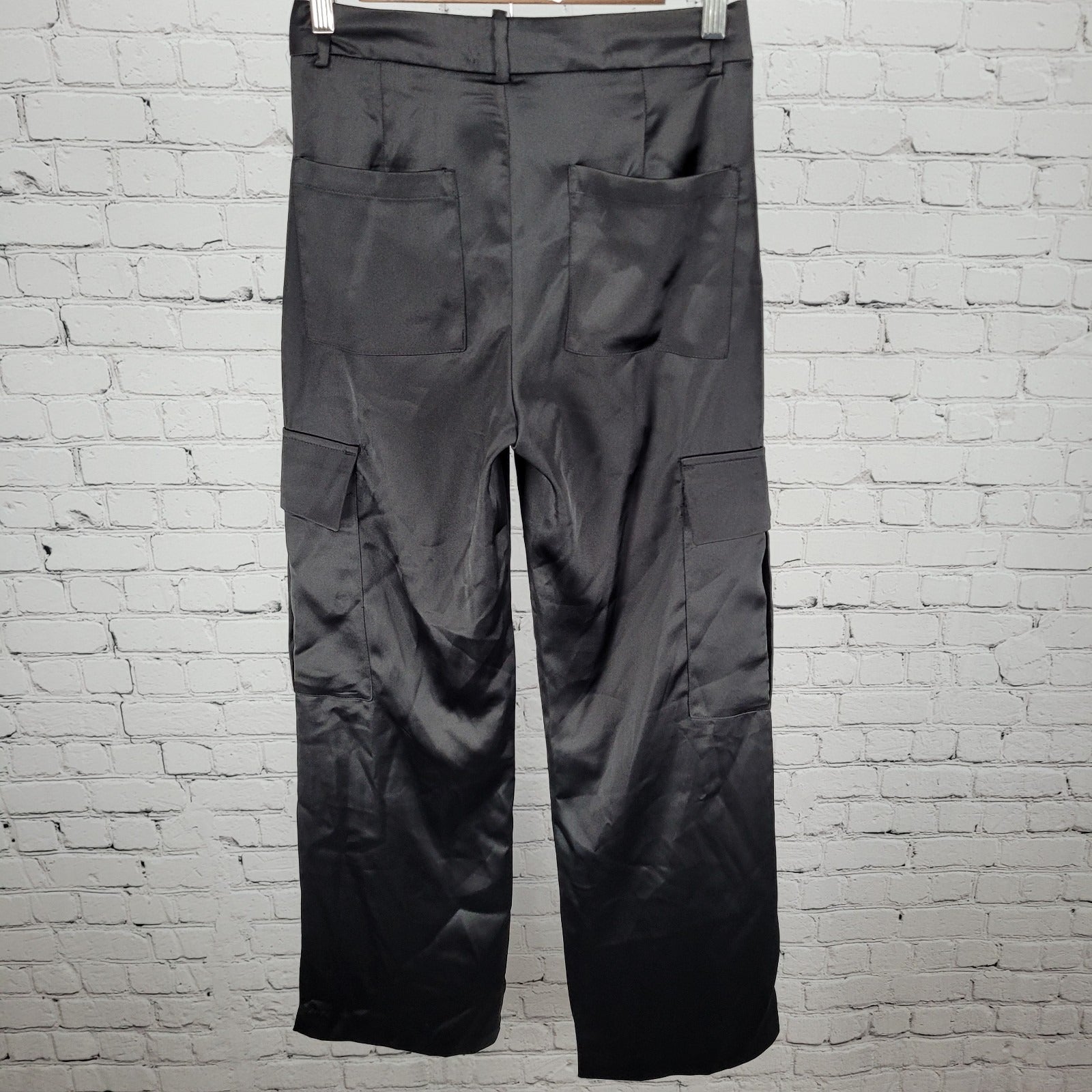 Zara Black Silky Satin Cargo Pockets Straight Leg Mid Rise Pants Size XS (26x29)