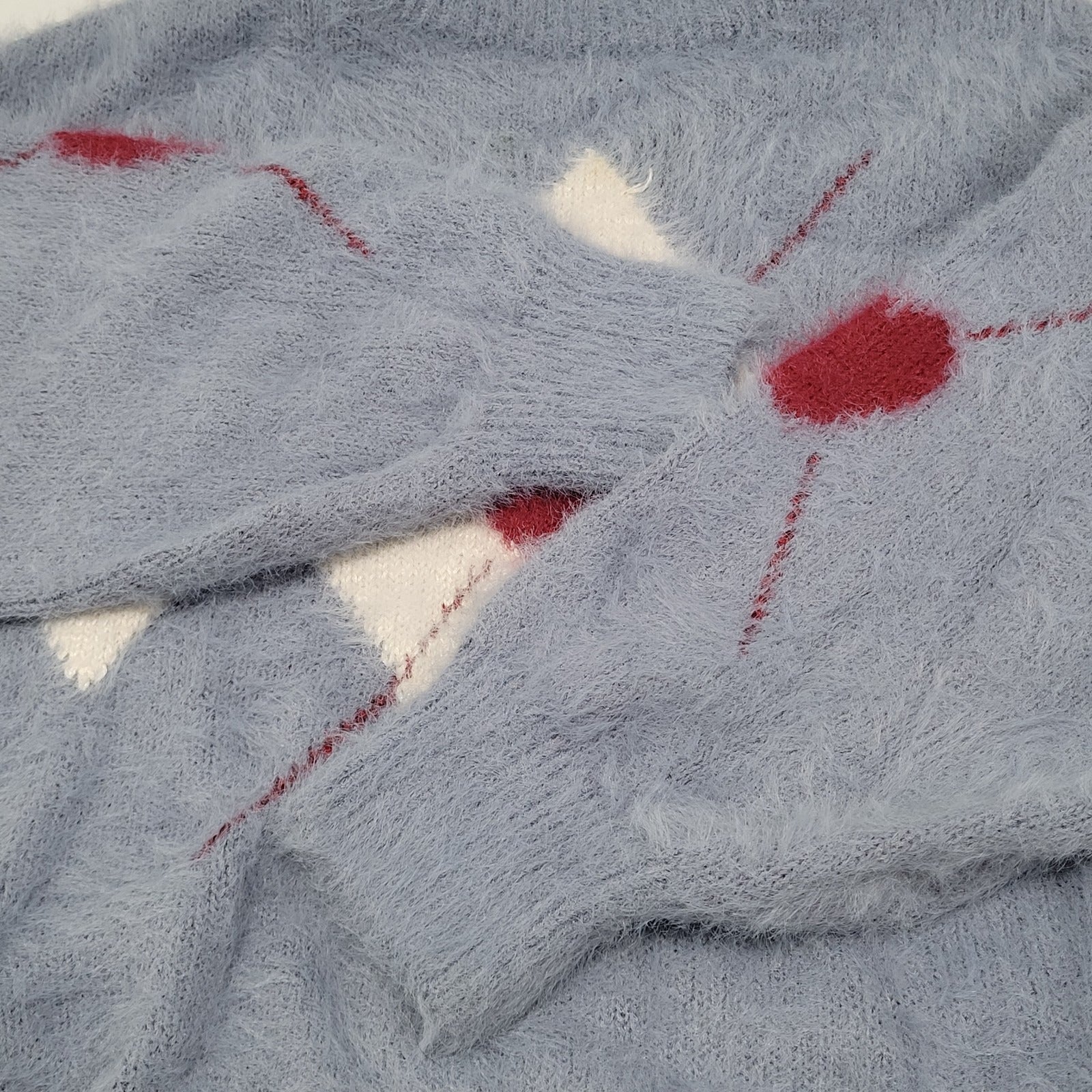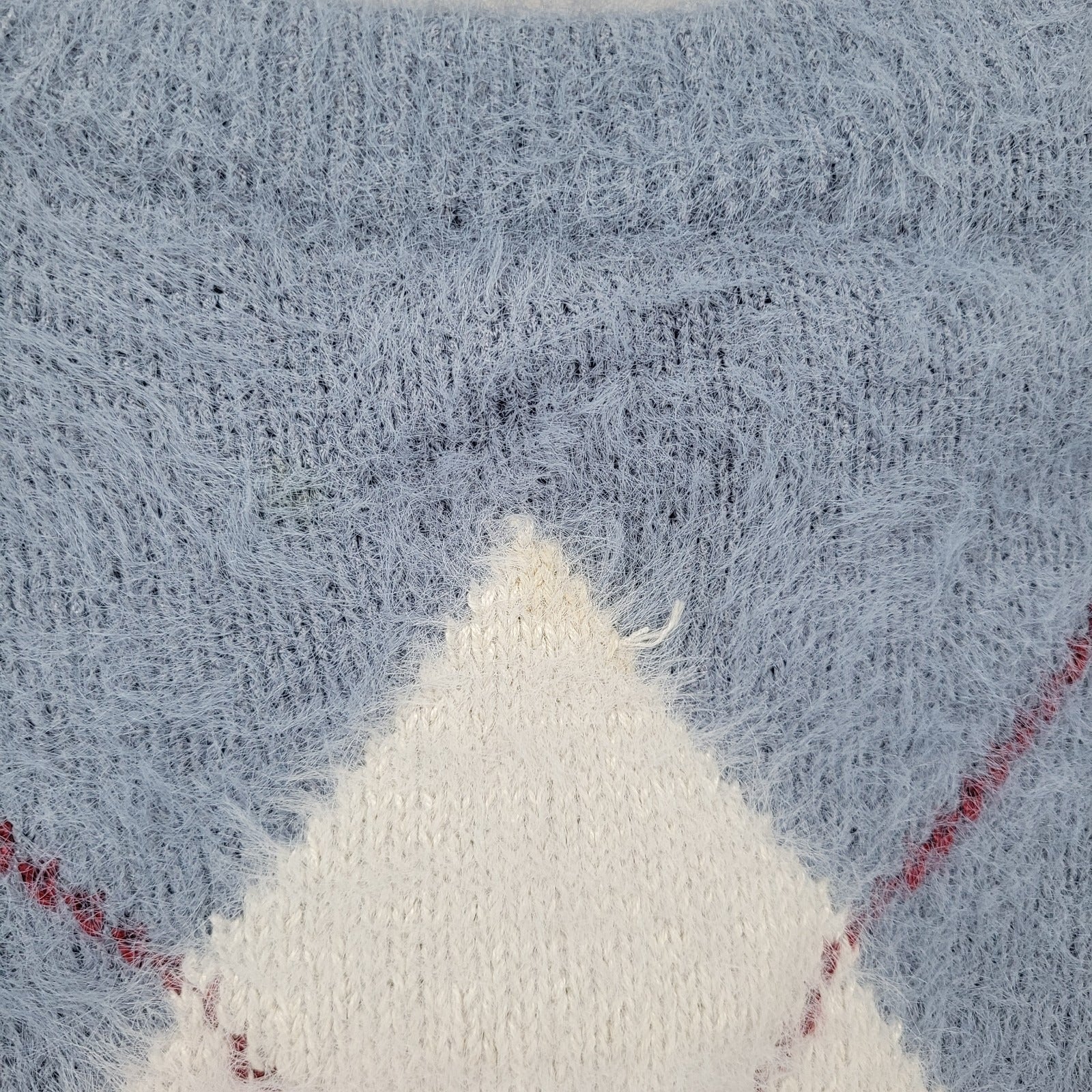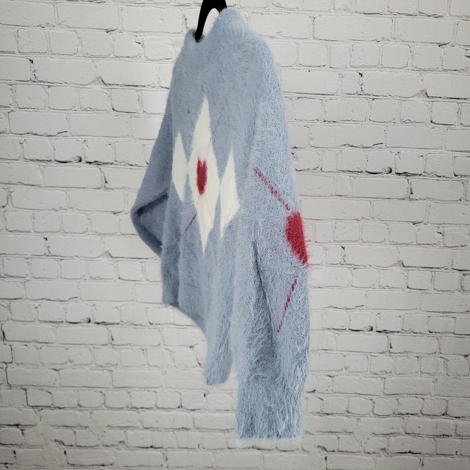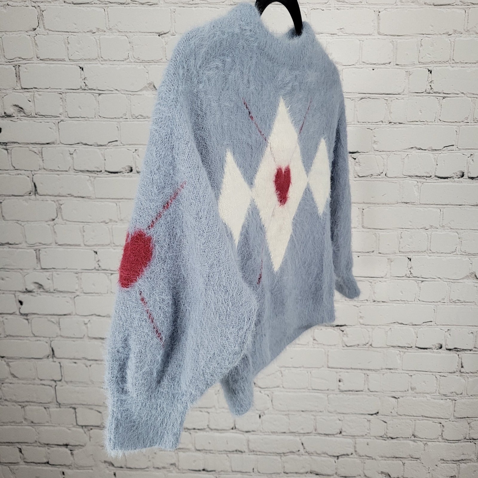 The Zara Knitwear Fancy Collection Blue Argyle Heart Long Sleeve Sweater is a stylish and cozy choice for girls size 7. Made from a blend of polyamide and acrylic, this pullover sweater features a classic crew neck and long sleeves, perfect for the cooler seasons. The argyle/diamond pattern with a heart theme adds a fun and feminine touch, making it ideal for casual or travel occasions. Easy to care for with machine washable instructions.
