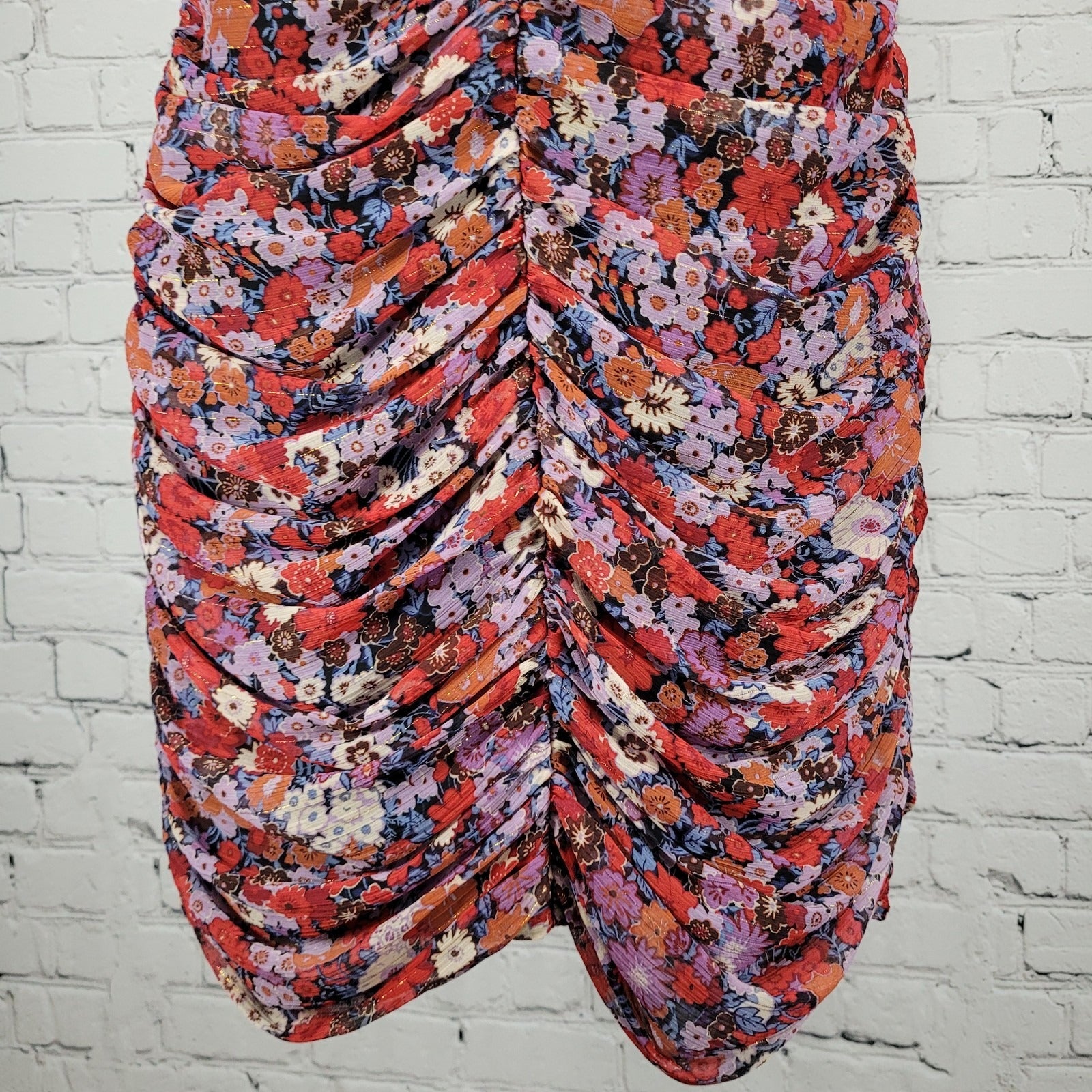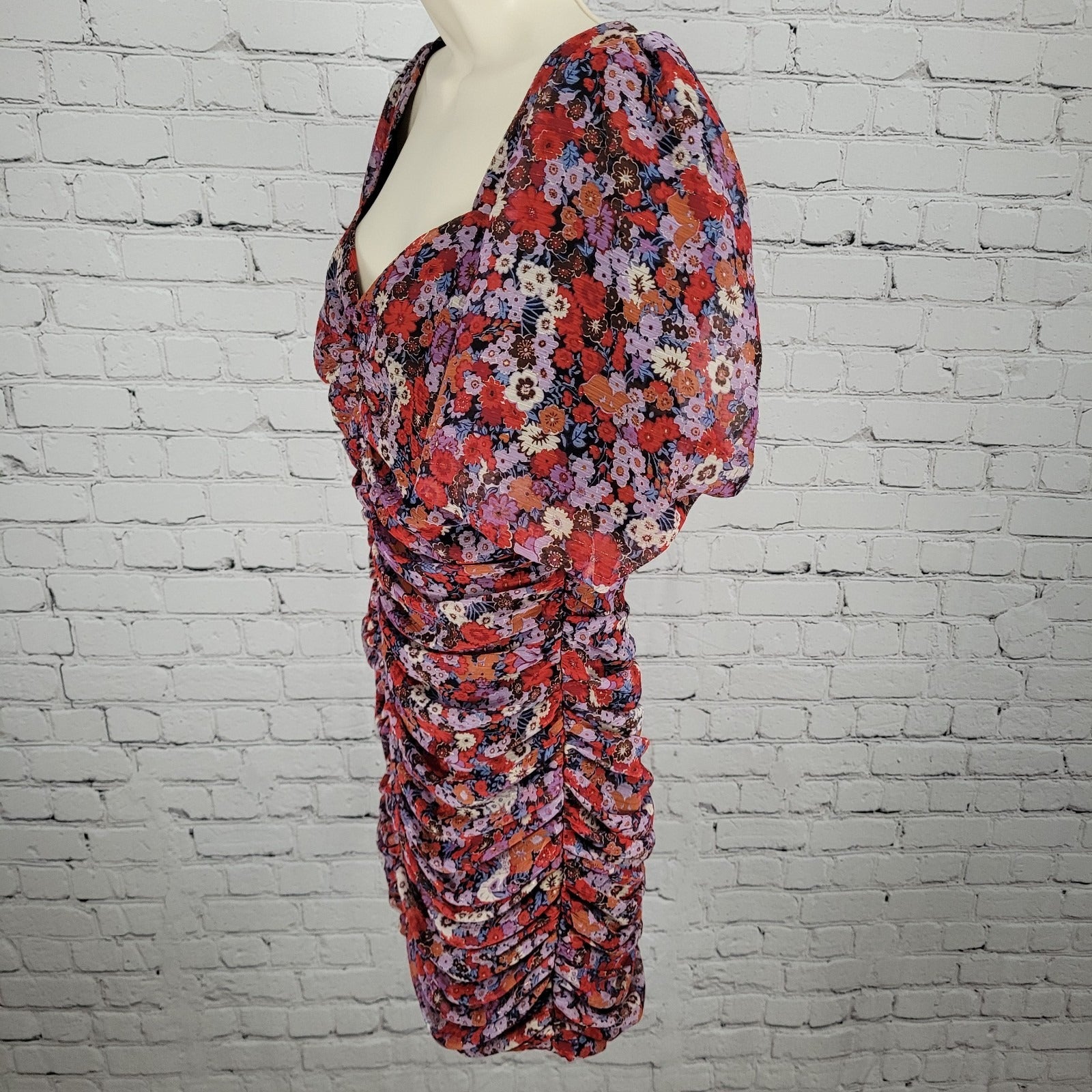 Zara Multicolor Floral Metallic Ruched Puff Sleeve Lined Dress Size Large L