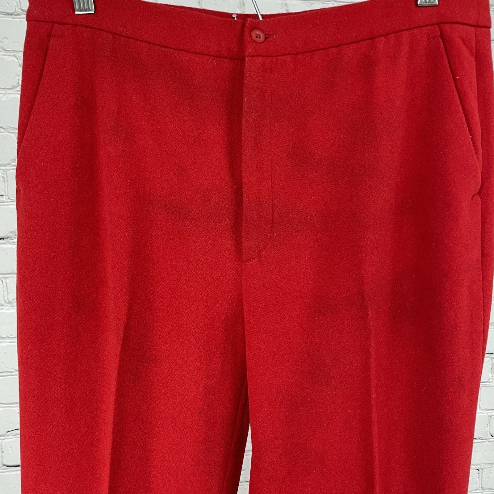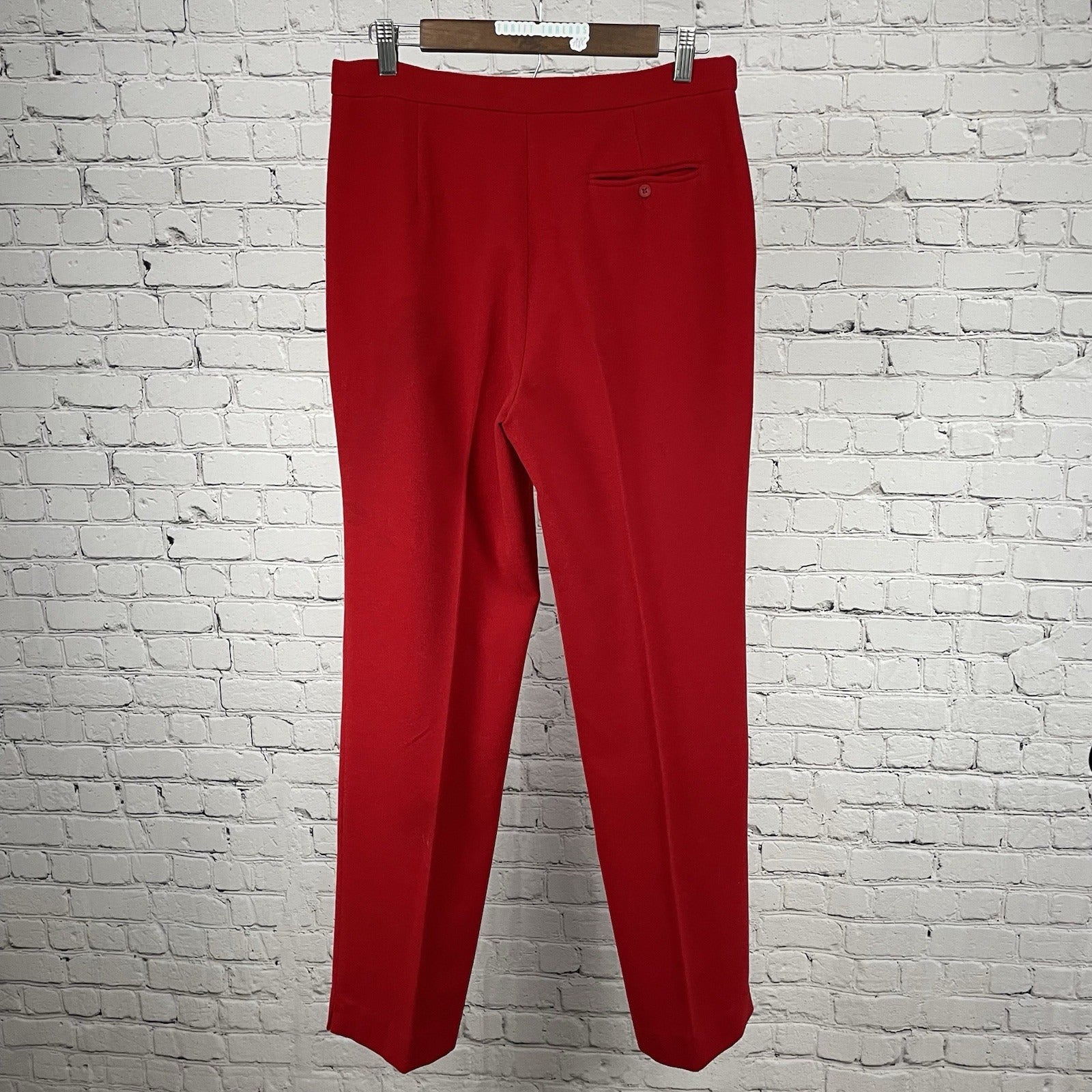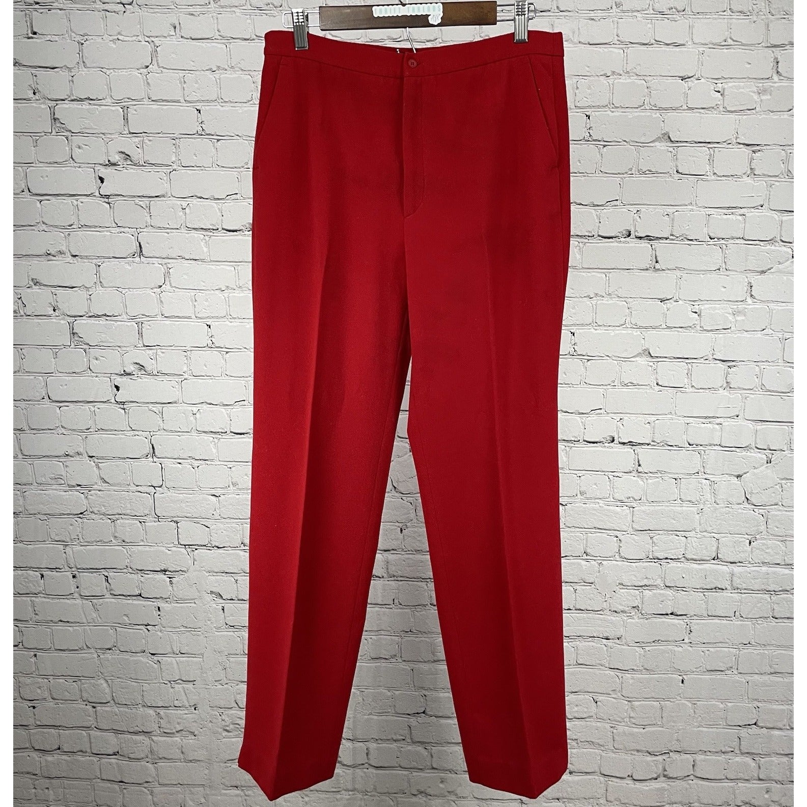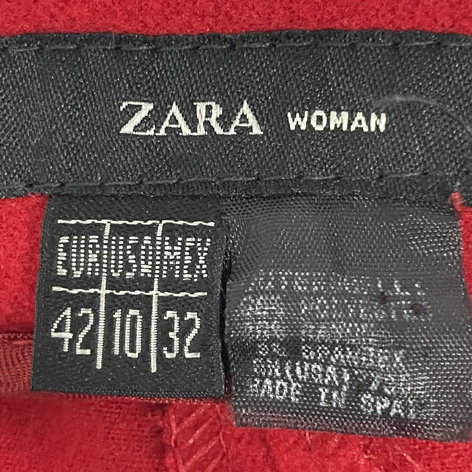 These Zara dress pants are a stylish choice for various occasions, featuring a high-rise fit with a straight leg design in a vibrant red color. Made of a soft wool-like material blend of polyester, spandex, and viscose, these pants are comfortable and machine washable for easy care. With a flat front and a 31-inch inseam, these pants are designed for a size US 10 with a 30-inch waist, suitable for regular fit. Perfect for workwear, parties, or casual outings, these pants offer a versatile and chic addition to any wardrobe.