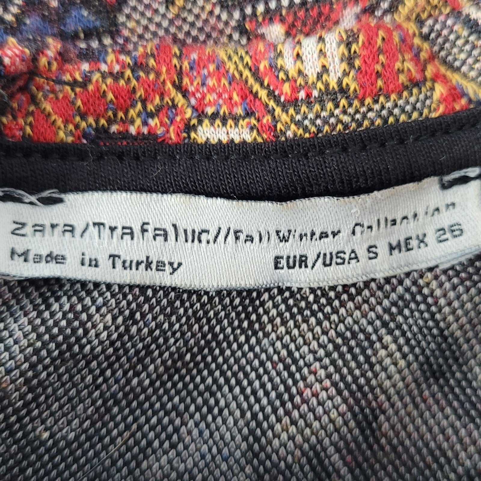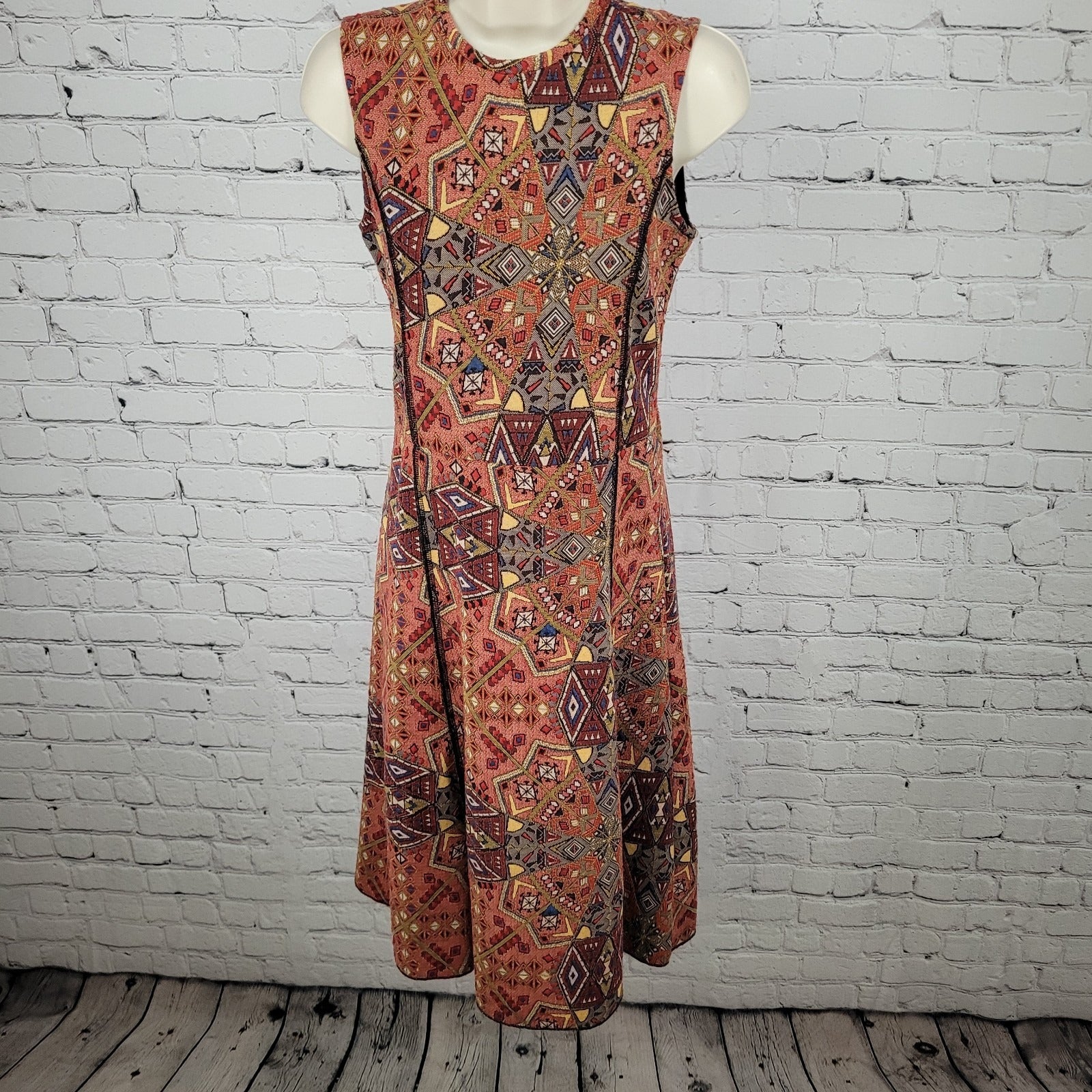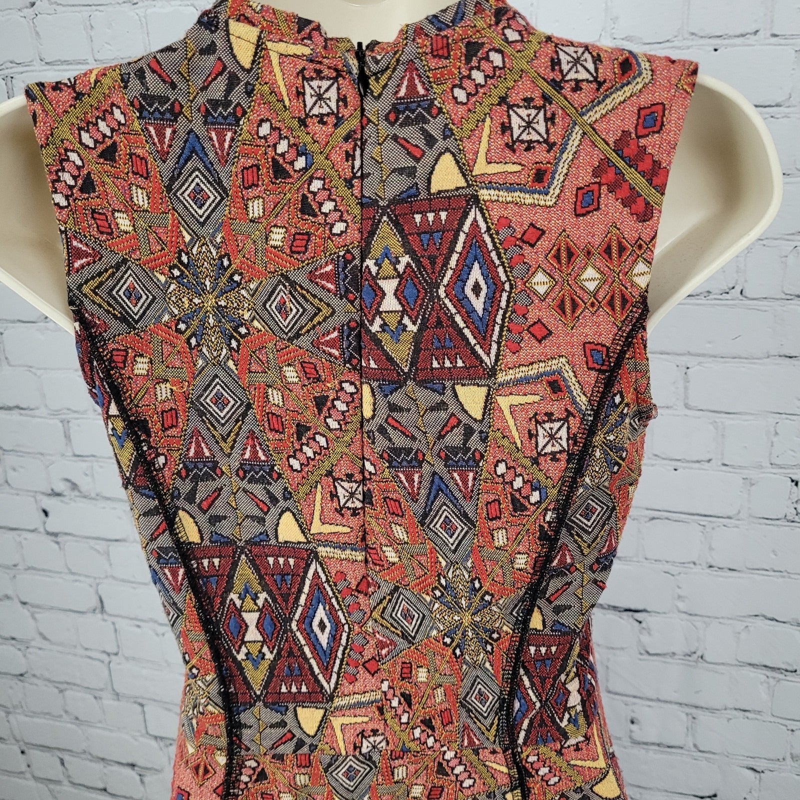 The Zara Trafaluc Orange Geometric Fall Winter Collection Stretch Dress in size Small S is a stylish and versatile piece perfect for various occasions. The sleeveless dress features a round neck, zip closure, and an A-line silhouette, making it flattering and comfortable to wear. Made from a blend of polyester, spandex, and viscose, the dress is machine washable and easy to care for. The geometric pattern and colorful bohemian theme add a fun and trendy touch.